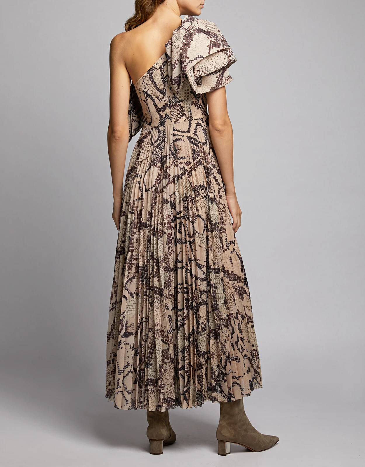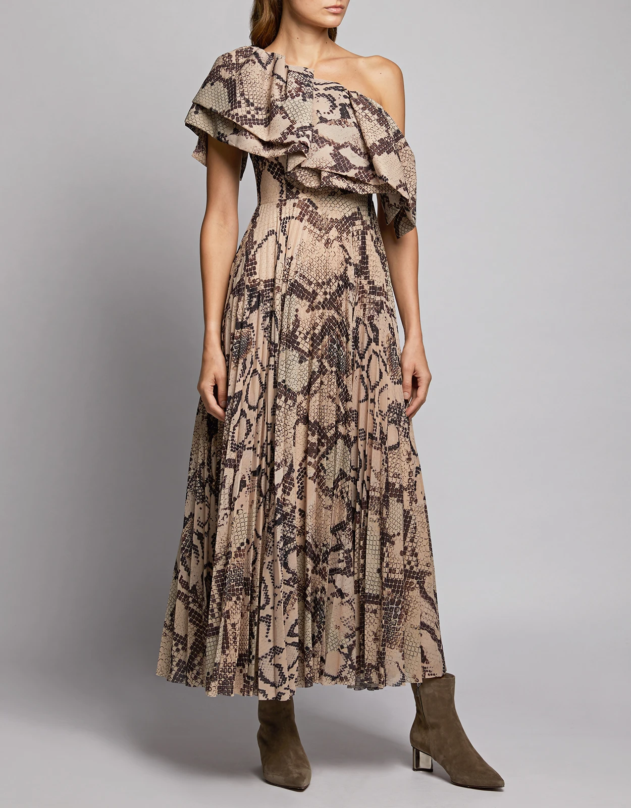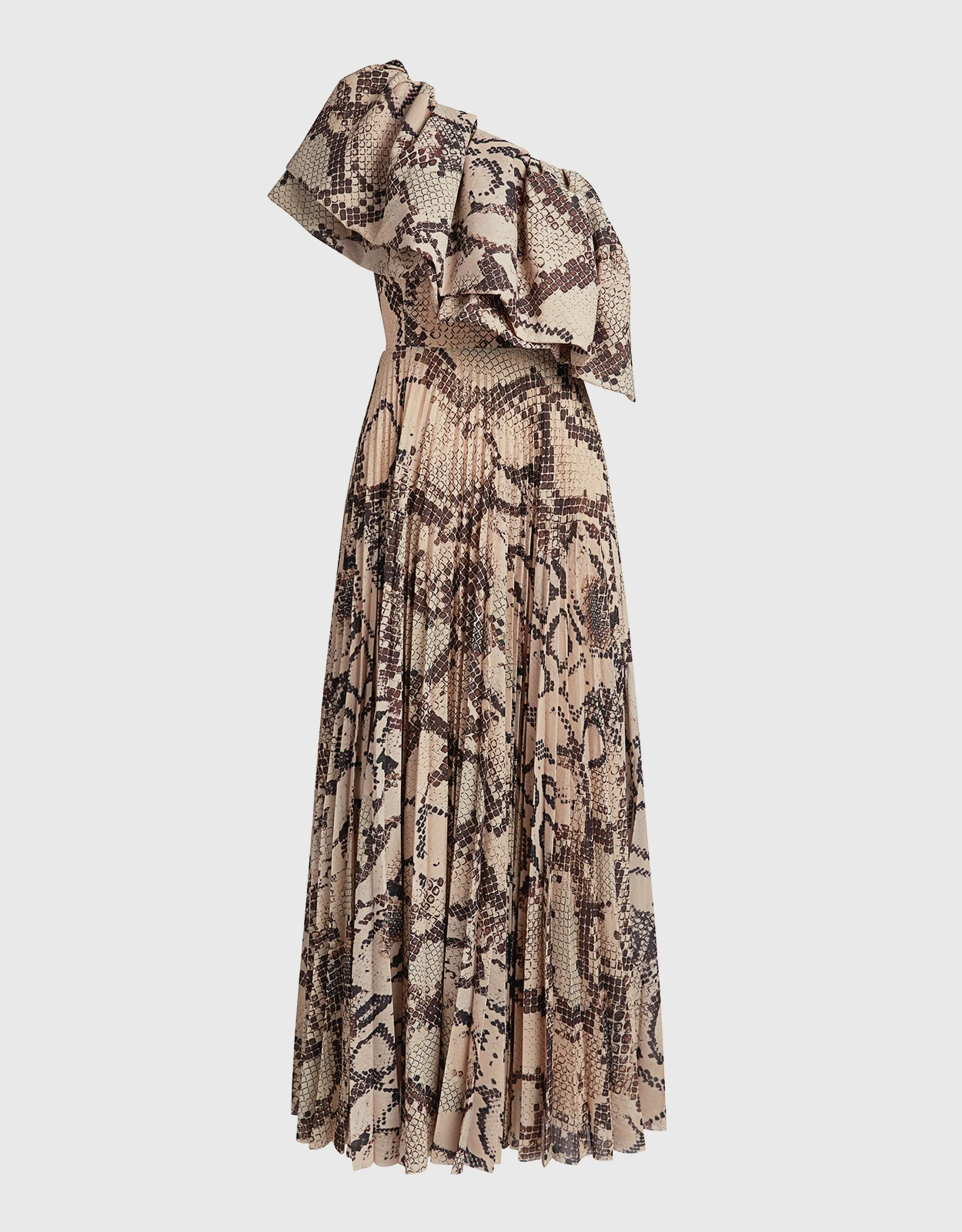 Solace London Rosa One-shoulder Snake Print Ruffle Pleated Maxi Dress
